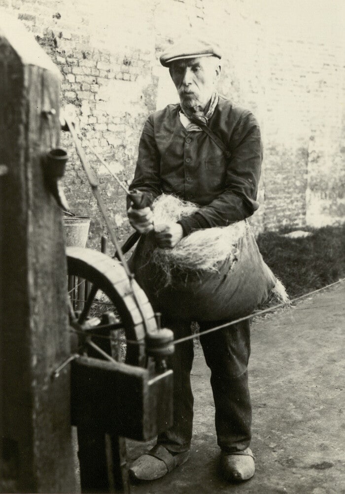 Rechts: het olieschilderij met als titel 'The Rope Maker (also known as Roper Joseph Lerou)', geschilderd door Florimond van Acker in 1916. Florimond (Flori) Arthur Joseph Van Acker (Brugge, 16 april 1858 – aldaar, 14 maart 1940) was een neoromantische, impressionistische Vlaamse kunstschilder, graveur, postzegelontwerper en directeur van de Brugse Academie.